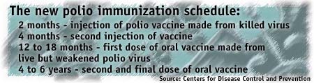 Starting in January 1997, it was recommended that children should get their polio vaccines in a combination of shots and sugar cubes. The policy, approved by the Centers for Disease Control and Prevention, is the first major change since 1961 in the way the vaccine has been administered. It says infants should be injected with a vaccine made from killed polio virus twice within their first four months, followed by two oral doses of weakened, live virus between ages 1 and 6. Most children now get three doses of oral vaccine by age 2.
